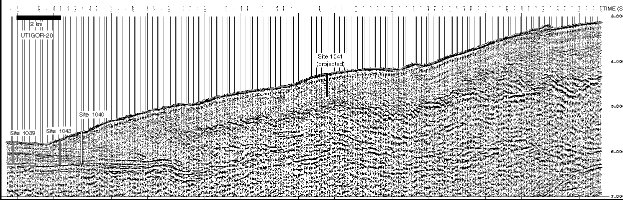 2D seismic reflection Profile CR-20, showing the location of Sites 1039, 1043, 1040, and 1041 (geometrically projected). Vertical scale is in two-way traveltime.