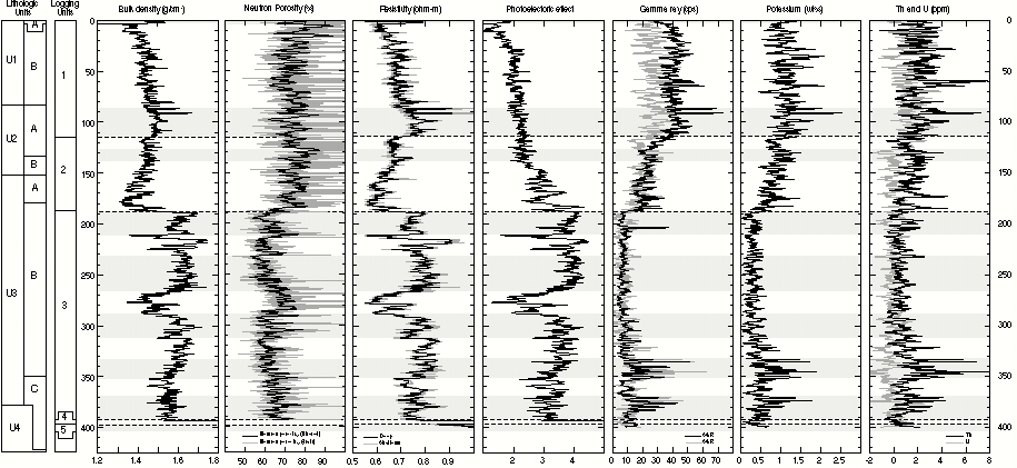 Summary of logging-while-drilling (LWD) results showing logging units and lithologic units at Site 1039. SGR: total spectral gamma ray, CGR: computed spectral gamma ray.
