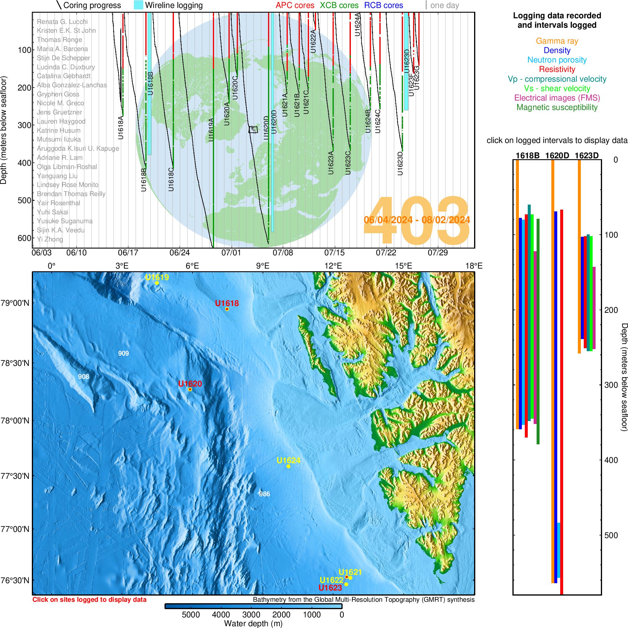 Click on hole names to access coring data, on cyan/yellow areas to access logging data, or on individual cores to get photo. Move over any core to display its ID.